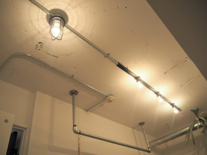 剥き出しの配管に間接照明。