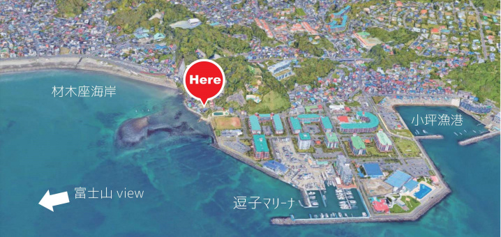 宅地内から海を望むが、30m先には広大な海が広がり、富士山・江ノ島も望む景色。