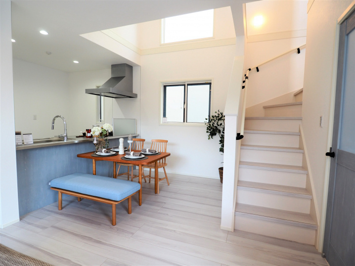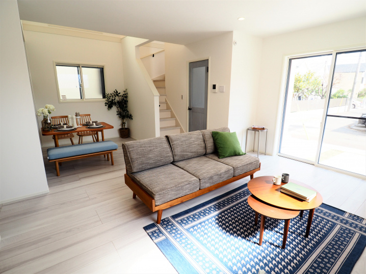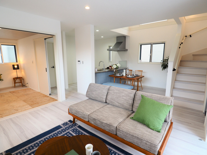 南向き2面採光の明るいリビング、隣接した5.2帖の和室、1階はLDK+和室の約23.9帖、開放的な空間です。