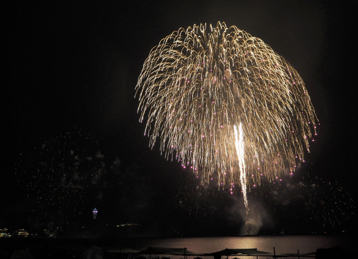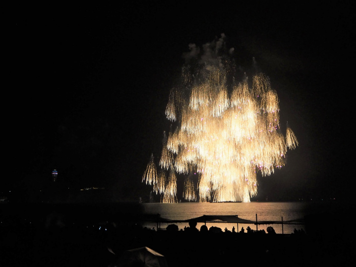 江ノ島の上空全てをおおうほどの直径約480mの大輪の華。