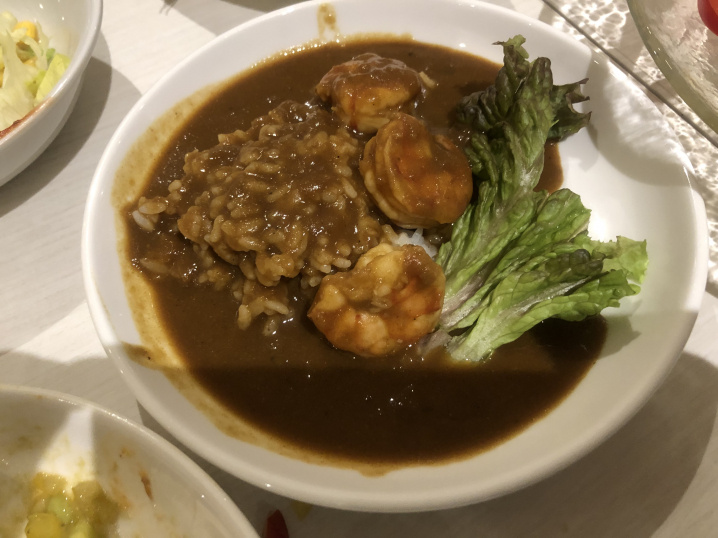 スパイスの効いたシュリンプカレーが食欲をそそります。