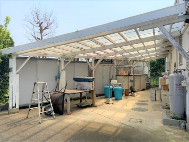 芝生の庭に屋根付きストックヤード、車5台分駐車できるスペース。