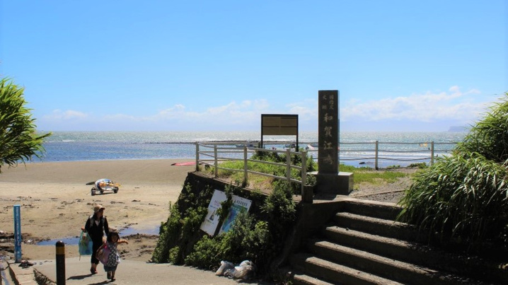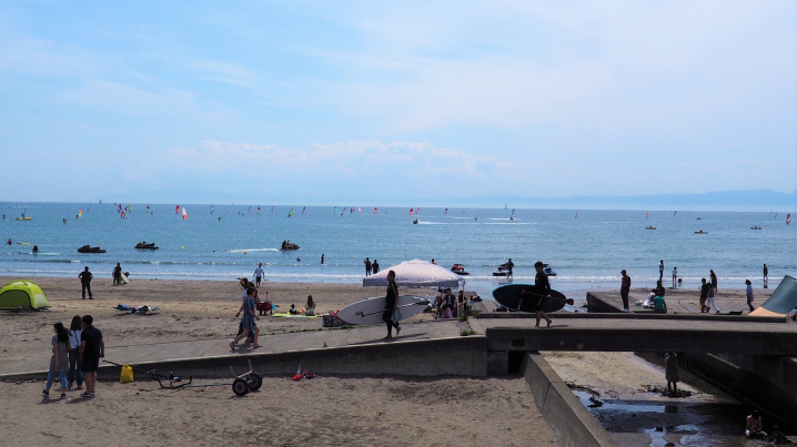 遠浅の材木座海岸まで歩いて4分、R134の下をくぐれば砂浜到着。