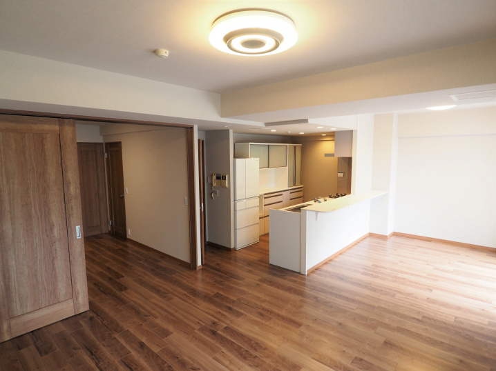 リビング隣接の約6帖洋室のスライドドアを全開放すれば、更なる開放的なリビングスペースへと変化する。
