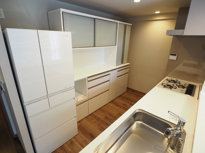 フルリノベ後、未使用の綺麗な状態で、エアコン3機・冷蔵庫・カップボード(いずれも新品)付き。