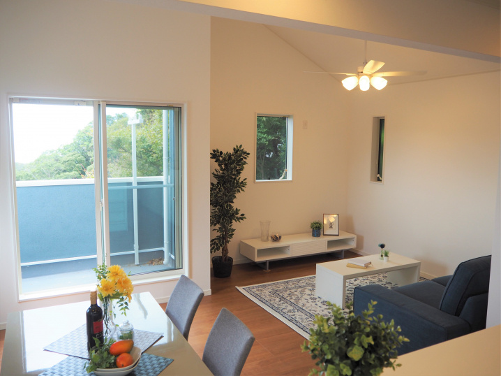 2階のLDKとバルコニーから葉山の街を見下ろし、その先に青く広がる海を望む癒しの景色が広がります。