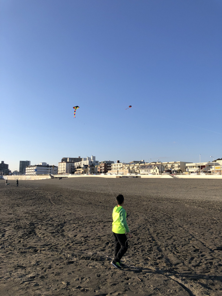 お正月に実家に集まり、じいじと一緒に子供たちを連れて海まで凧揚げをしにいきました!