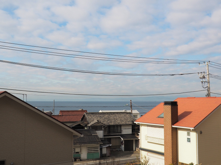 奥行きのあるワイドなバルコニーから少しだけ海を望む。