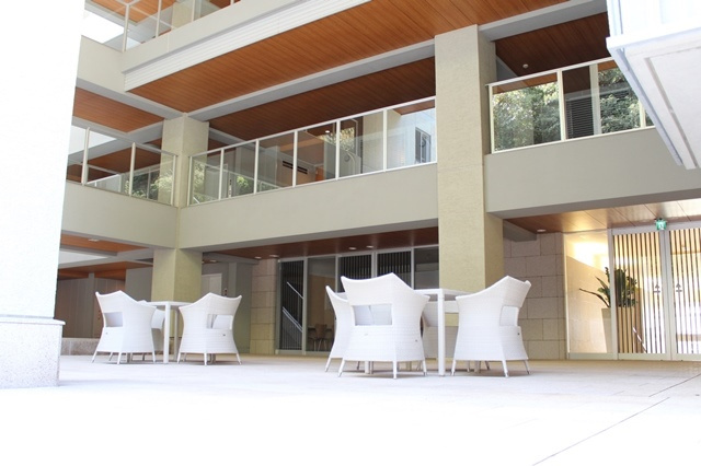 開放的なエントランスから緑の景色を望み、その先には三層吹き抜けのプライベートガーデン。
