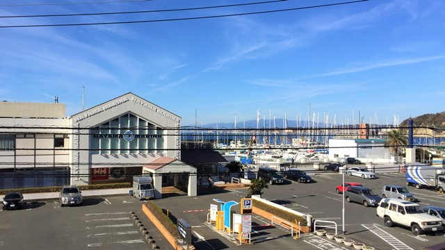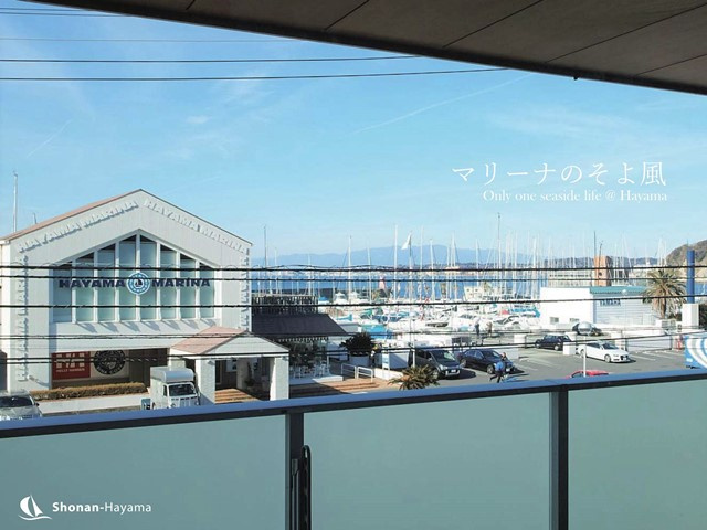 バルコニーから葉山マリーナとその先に海を望む景色。