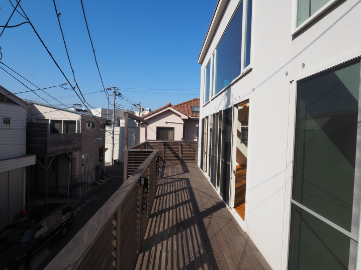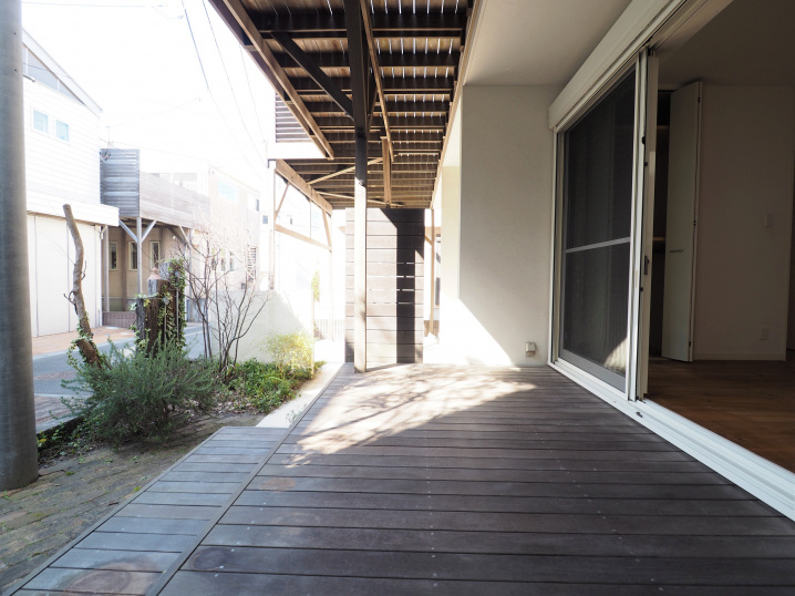その光の先の窓を開ければ、広いウッドデッキバルコニーへと繋がる。