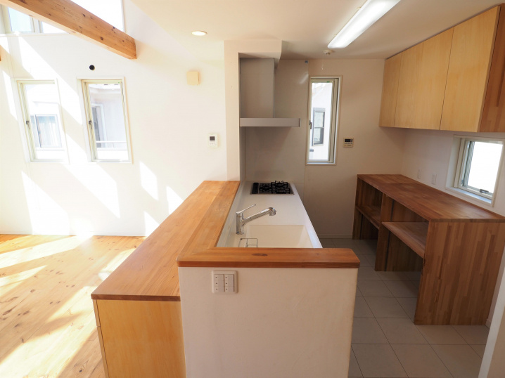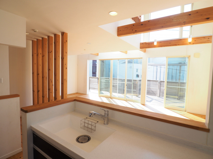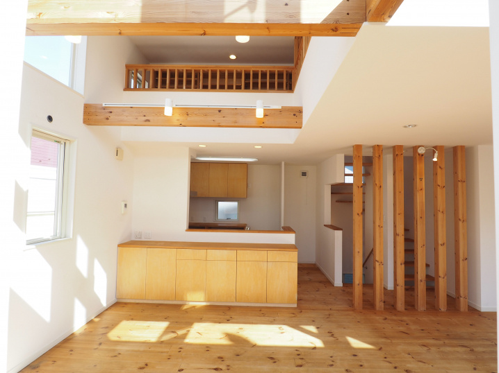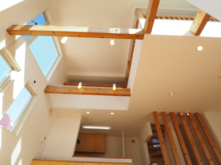 2階に上がると吹抜けの上の大きな窓から沢山の陽光が差し込む、開放的なLDK。