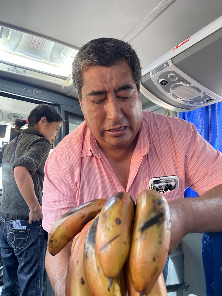 バスの中では現地ガイドさんが大きなバナナを配ってくれた。