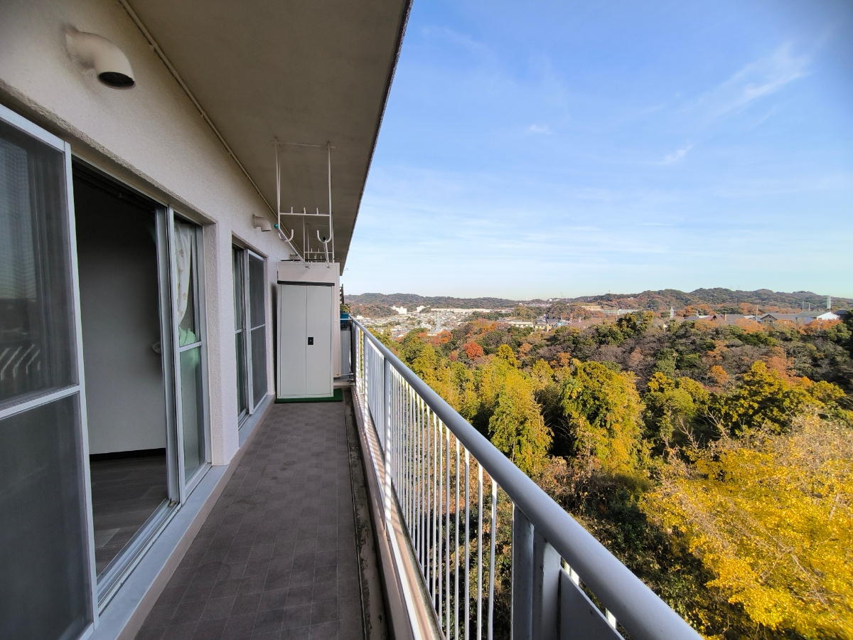 リビングの窓辺から緑豊かな山々を望み、バルコニーからは逗子の街を一望するパノラマビューが広がる。