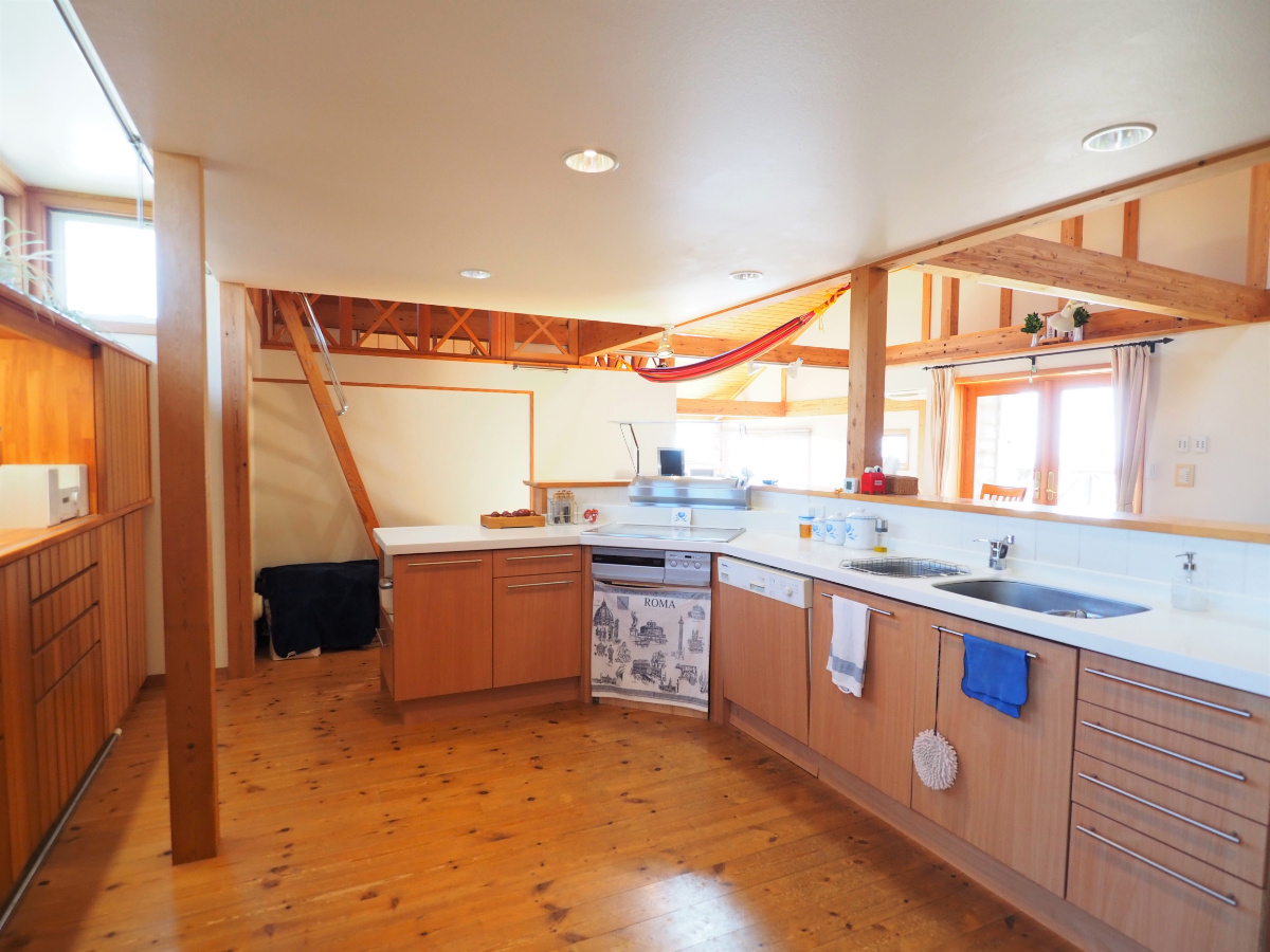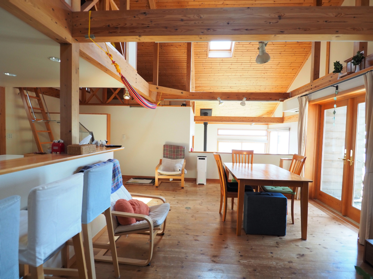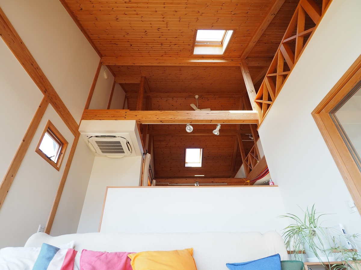 床、天井に無垢のパイン材を使用した温かみのある自然素材の家。