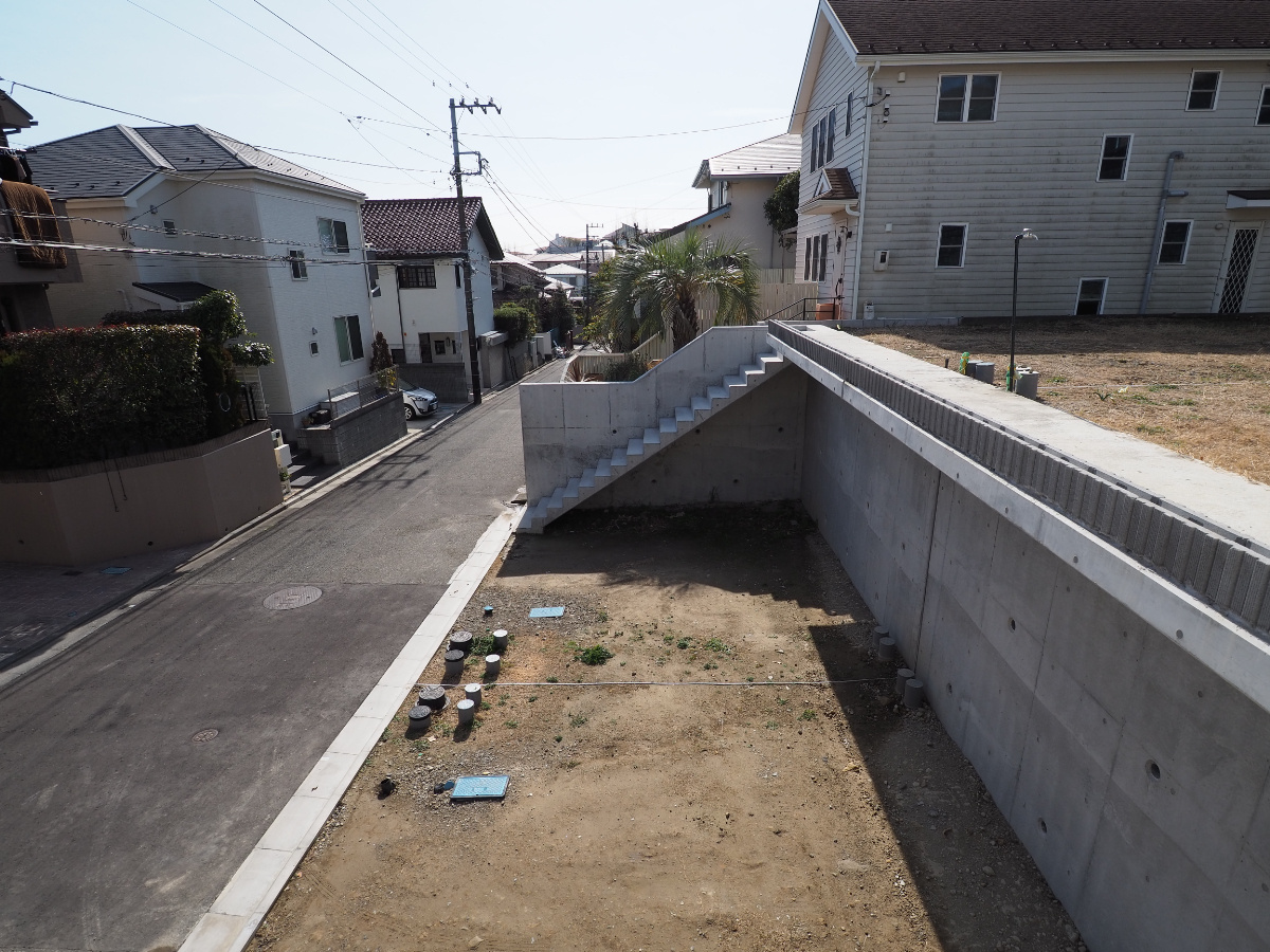 2台分のカースペースを設け、宅地部分は一段上がり、道路からの視界を外せる立地。