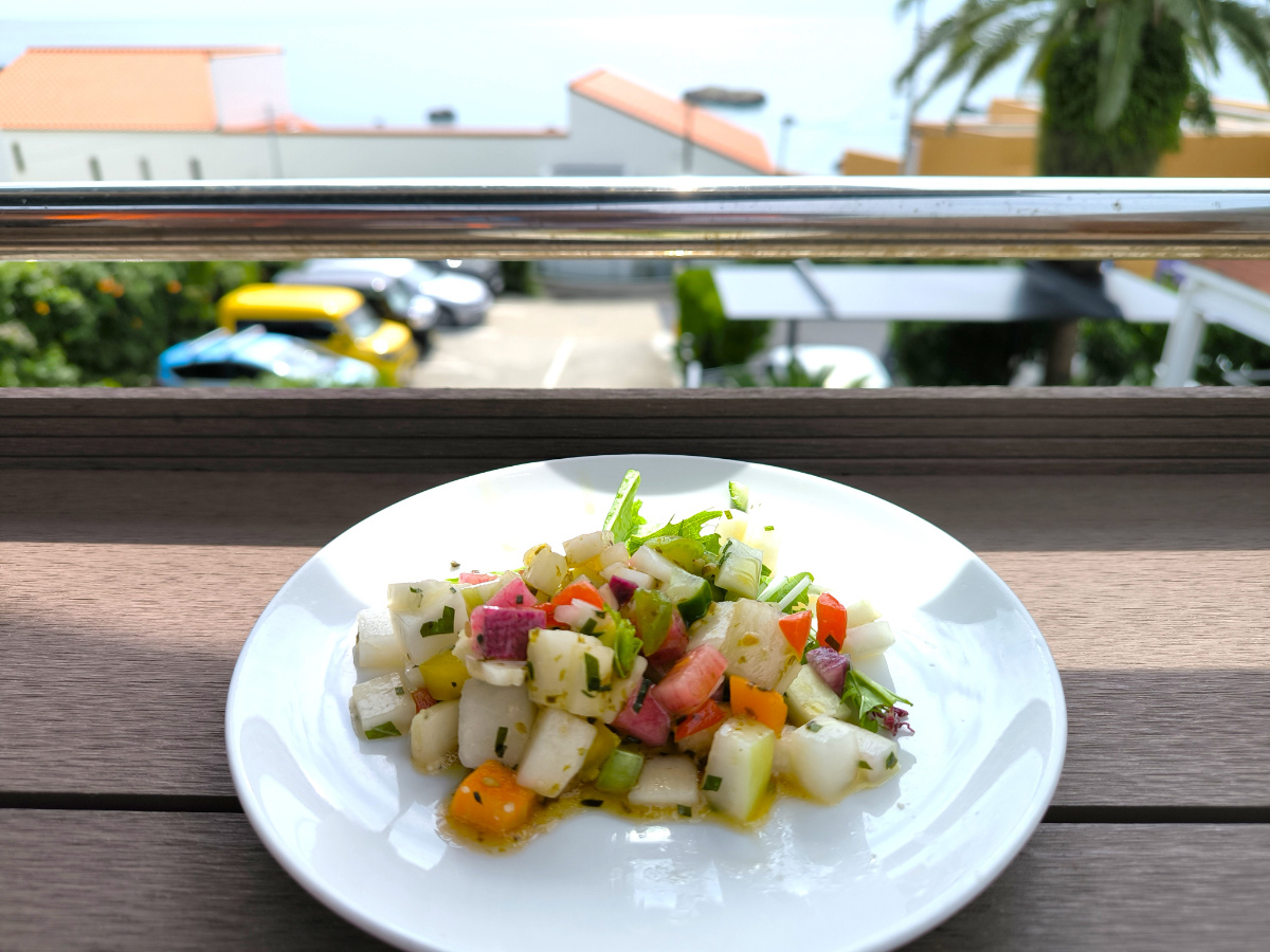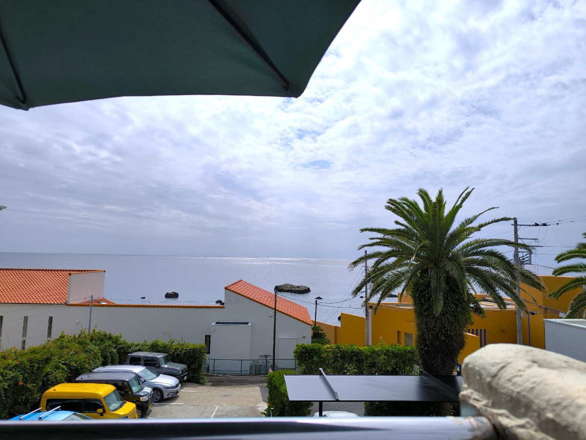 テラス席は、以前丸テーブルがいくつか並んでいましたが、2年前に改装して、海方向にカウンターテーブルを設置しました。
