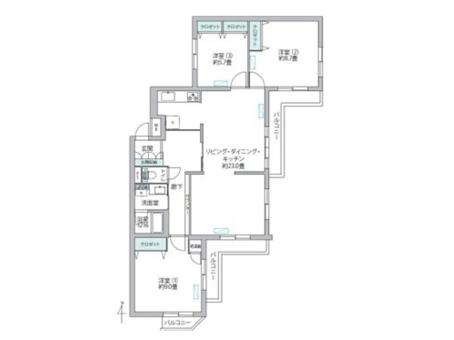 東側に2面のバルコニーと、南側に1面のバルコニー。