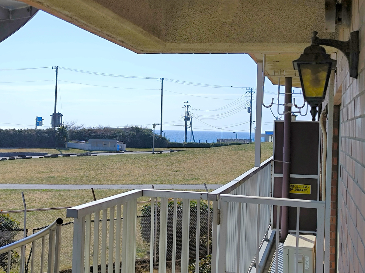 南側バルコニーからは、海浜公園越しに海を望む景色が広がる。