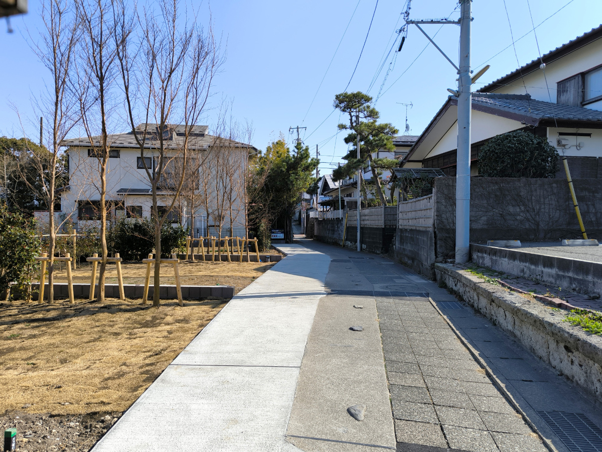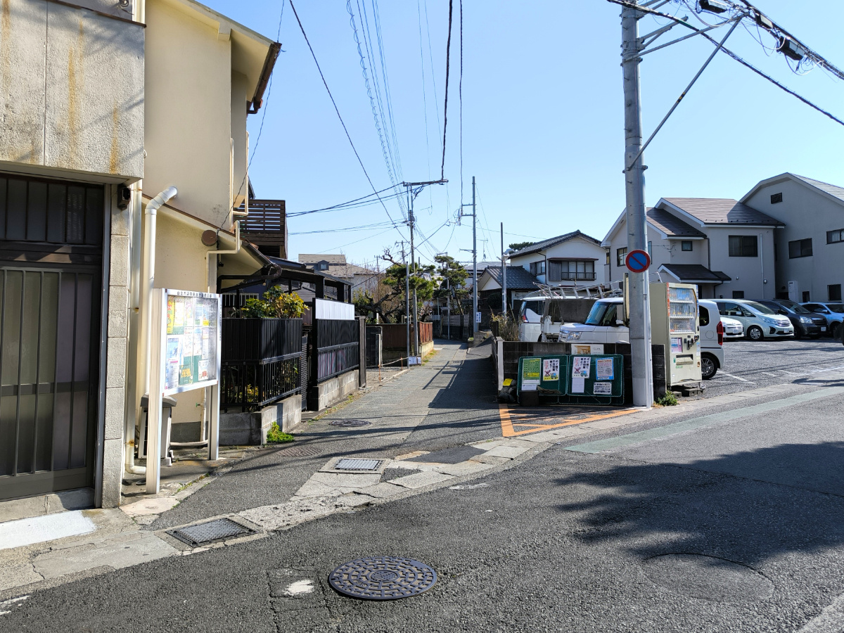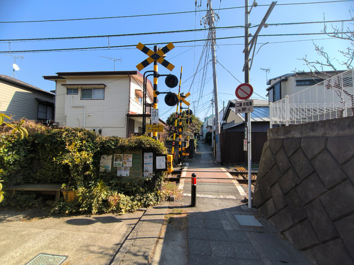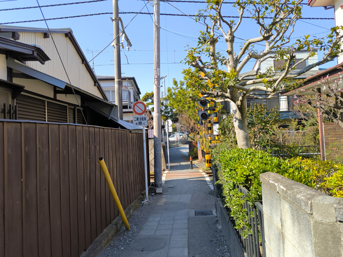 現地から約30m先には、江ノ電が走る風情ある路地裏へと続く。