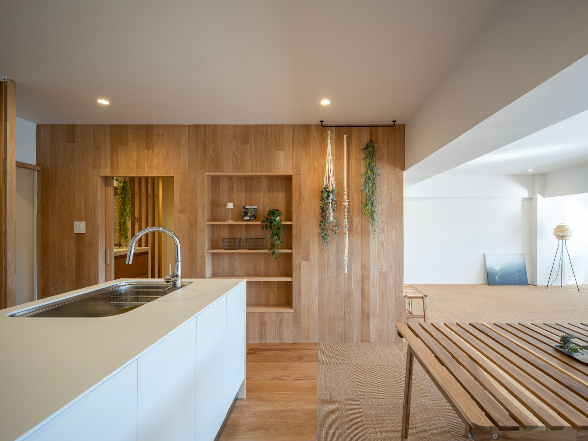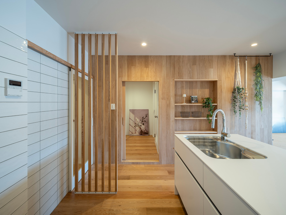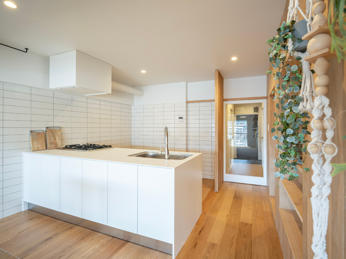 リビングダイニングを見渡せる開放的な対面式キッチン。